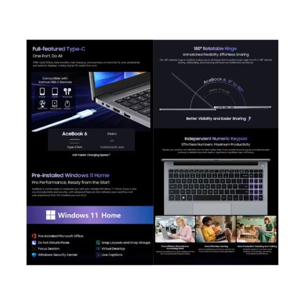 Er AceBook 6 Es ist mit vorinstalliertem Windows 11 Home und einem Intel® Twin Lake N150 Prozessor mit bis zu 3,6 GHz ausgestattet. Das sorgt für effizientes Multitasking und schnelle Reaktionszeiten in Ihren Lieblings-Apps. Der 38-Wh-Akku sorgt zudem für lange, unterbrechungsfreie Tage.