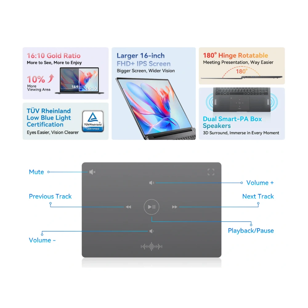 With a metal casing, a weight of only 1.6 kg, and Dual BOX stereo speakers, the AceBook 12 combines elegant design with functionality. Its fingerprint reader provides security and convenience for everyday use, whether in the office or working remotely. The screen can rotate from 0° to 180° to adapt to your needs.