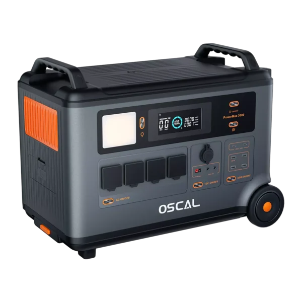 La OSCAL PowerMax 3600 combina una capacidad de 3600 Wh con una batería de fosfato de hierro y litio (LiFePO4) que ofrece más de 3500 ciclos de vida útil. Su potencia de salida continua de 3600 W (pico de 7200 W) permite alimentar herramientas, electrodomésticos y dispositivos electrónicos de forma segura gracias a su onda sinusoidal pura. Incorpora entradas AC y solar (hasta 2200 W y 1600 W respectivamente) que, combinadas, permiten una carga completa en 1,2 horas. Cuenta con una amplia variedad de puertos: 4 salidas AC, USB-C de 100 W, USB-A, Anderson y DC 5521, entre otros. Su sistema inteligente de gestión de batería garantiza seguridad y rendimiento incluso en condiciones extremas de temperatura. Con diseño robusto, ruedas integradas, certificaciones internacionales y 4 años de garantía, el PowerMax 3600 es una solución energética versátil y fiable.