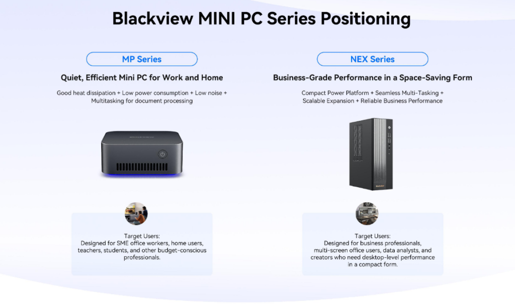I Mini PC di Blackview rappresentano l'impegno del marchio verso l'informatica desktop compatta. Sono progettati per gli utenti che cercano un equilibrio tra prestazioni e ottimizzazione dello spazio, offrendo un'esperienza informatica completa in un formato minimale.