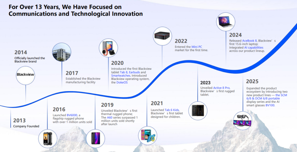 Blackview si è evoluta da produttore focalizzato su telefoni robusti a marchio tecnologico globale con un catalogo di prodotti molto diversificato. Questa evoluzione è stata guidata dal suo fondatore, Davide Xu, che ha guidato l'espansione dell'azienda al di là dei dispositivi per esterni.
