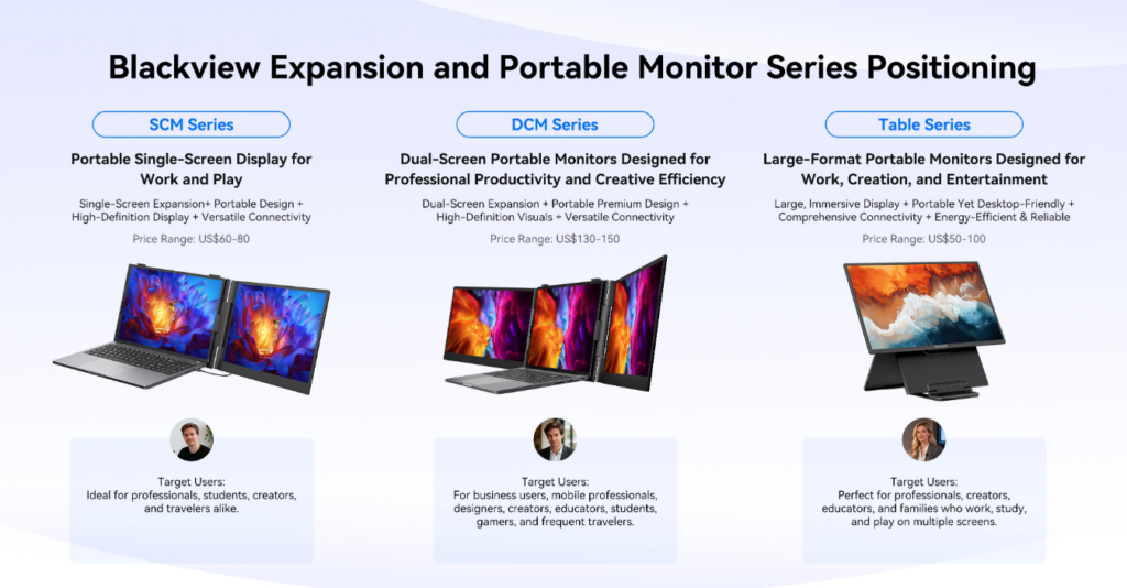 Blackview ha aggiunto al suo ecosistema una linea di monitor portatili, pensati per chi ha bisogno di ampliare il proprio spazio di lavoro con la massima mobilità. Questi dispositivi rappresentano la soluzione ideale per aumentare la produttività senza i limiti di un monitor fisso da scrivania.
