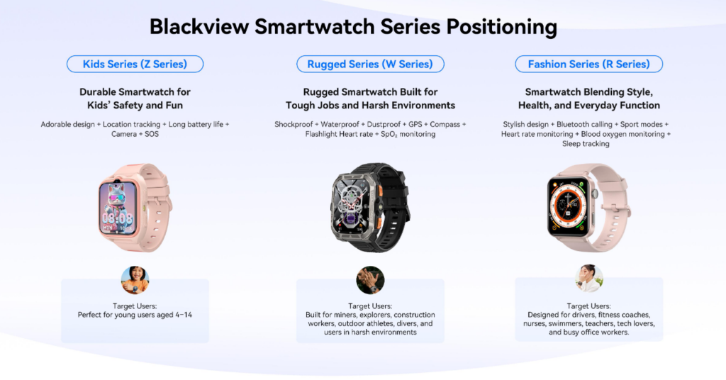 La linea di dispositivi indossabili di Blackview riflette la versatilità del marchio, adattandosi alle esigenze di ogni membro della famiglia. Questi dispositivi integrano funzionalità per la salute, il fitness e la connettività in design adatti a diversi stili di vita.
