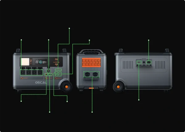 OSCAL PowerMax 3600 combina una capacitร di 3600 Wh con una batteria al litio ferro fosfato (LiFePO4) che offre oltre 3.500 cicli di vita. La sua potenza di uscita continua di 3600 W (7.200 W di picco) gli consente di alimentare in sicurezza utensili, elettrodomestici e dispositivi elettronici grazie alla sua onda sinusoidale pura. Incorpora ingressi CA e solare (rispettivamente fino a 2.200 W e 1.600 W) che, combinati, consentono una ricarica completa in 1,2 ore. Dispone di un'ampia varietร di porte: 4 prese CA, USB-C da 100 W, USB-A, Anderson e DC 5521, tra le altre. Il suo sistema di gestione intelligente della batteria garantisce sicurezza e prestazioni anche in condizioni di temperatura estreme. Con un design robusto, ruote integrate, certificazioni internazionali e una garanzia di 4 anni, PowerMax 3600 รจ una soluzione di alimentazione versatile e affidabile.
