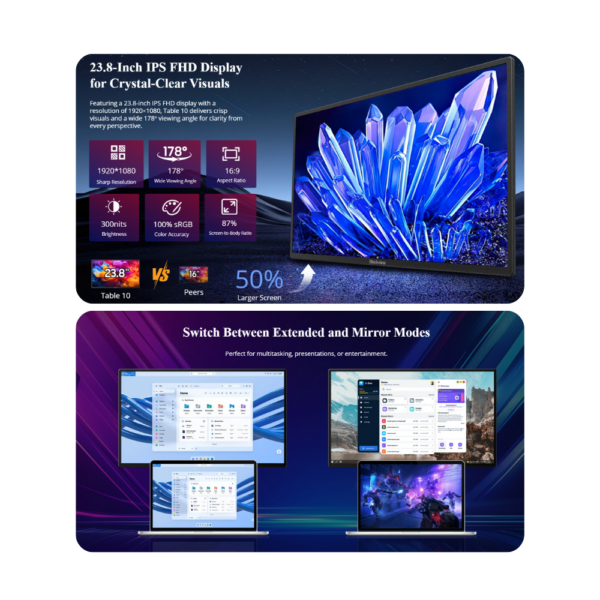 Projetado para quem precisa Mais espaço de trabalho, maior conforto e mobilidade total., o Blackview TABELA 10 é um Tela portátil de 23,8” que transforma qualquer espaço em seu escritório ou centro de entretenimento. amplo ângulo de visão de 178º E seu design leve oferece uma experiência visual confortável e envolvente, ideal para trabalhar, estudar ou desfrutar de conteúdo multimídia sem complicações.