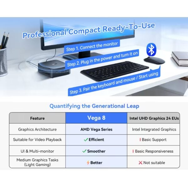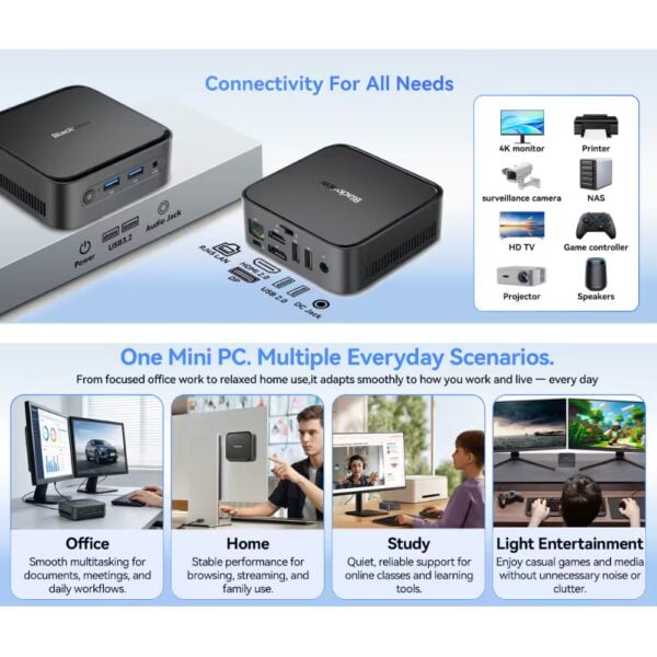 Ele Blackview MP20 é um Mini PC compacto e potente, Projetado para quem procura Alto desempenho em espaço mínimo. Perfeito para Trabalhar em casa, viajar ou receber visitas em casa., Ele combina eficiência, versatilidade e confiabilidade em um único equipamento.